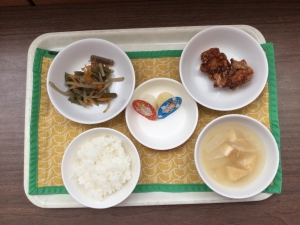 ごはん 豚肉のごま煮 小松菜のお浸し みそ汁 ジュース エネルギー 473 Kcal、 たんぱく質 15.9g、 脂質 13.0 g、 塩分 1.5g