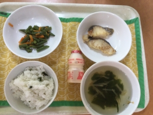 わかめごはん 白身魚のごましょうゆ焼 インゲンの中華和え すまし汁 ジュース