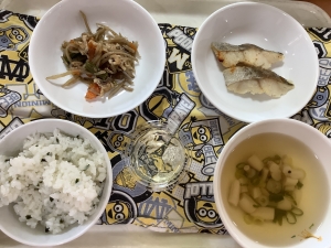 わかめごはん たらの西京焼 五目金平 すまし汁 手作りりんごゼリー