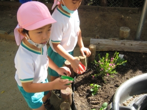 年中さんでお池の周りに新しいお花を植えることになりました。