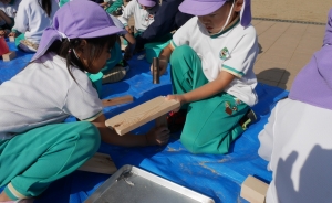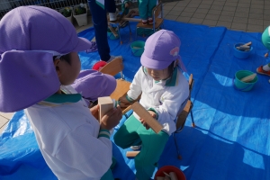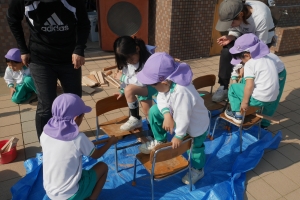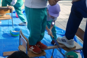 木材の太さや長さ、厚さ、いろいろなものがある中で、「これを切って、顔にしよう」「この木で足を作ろう!」と、友だちと協力して部品を揃えていきました。