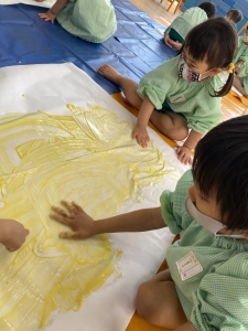 大きな模造紙にみんなでフィンガーペイントをして遊びました。