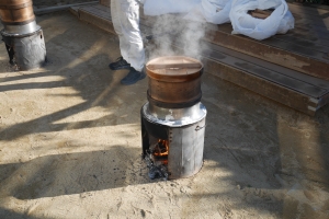 釜戸に火をくべ、せいろでもち米を蒸します。