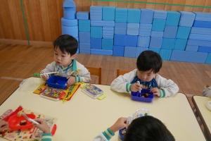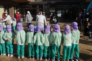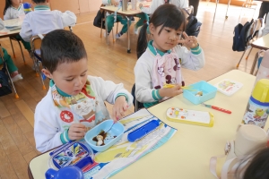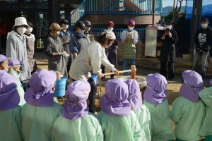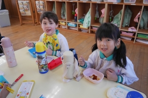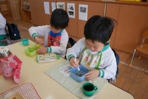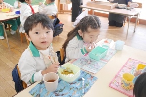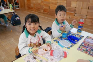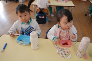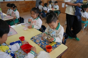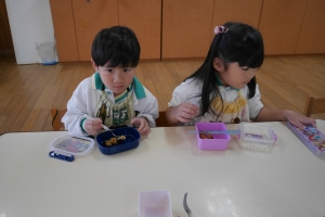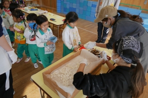 ぺんぎん組、ぱんだ組さんは、蒸したもち米を小さく丸めたおにぎりをいただきました。