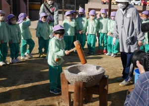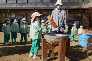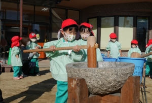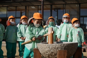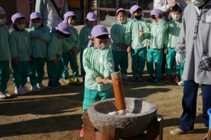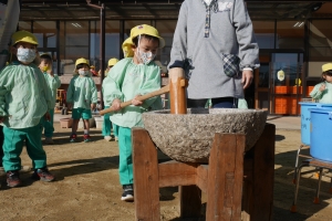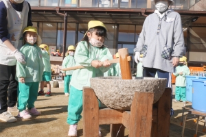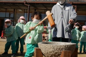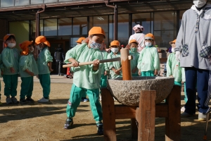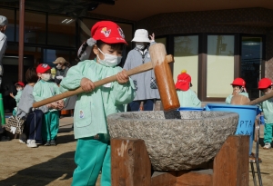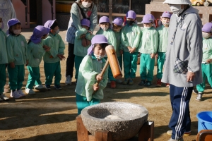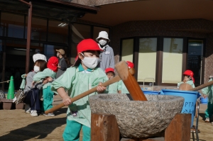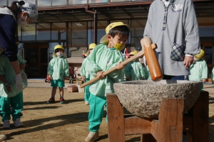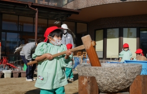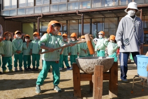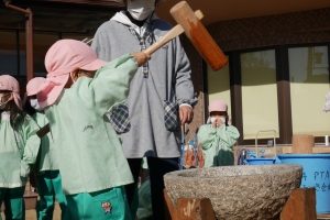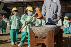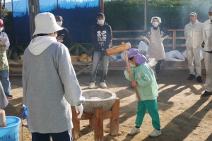炊きあがったもち米を臼にいれて、お手伝いのお父さんたちの力を借りて、