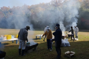 落ち葉を入れ、先生たちは煙がモクモクする中、お芋が焼けるまで頑張りました💪